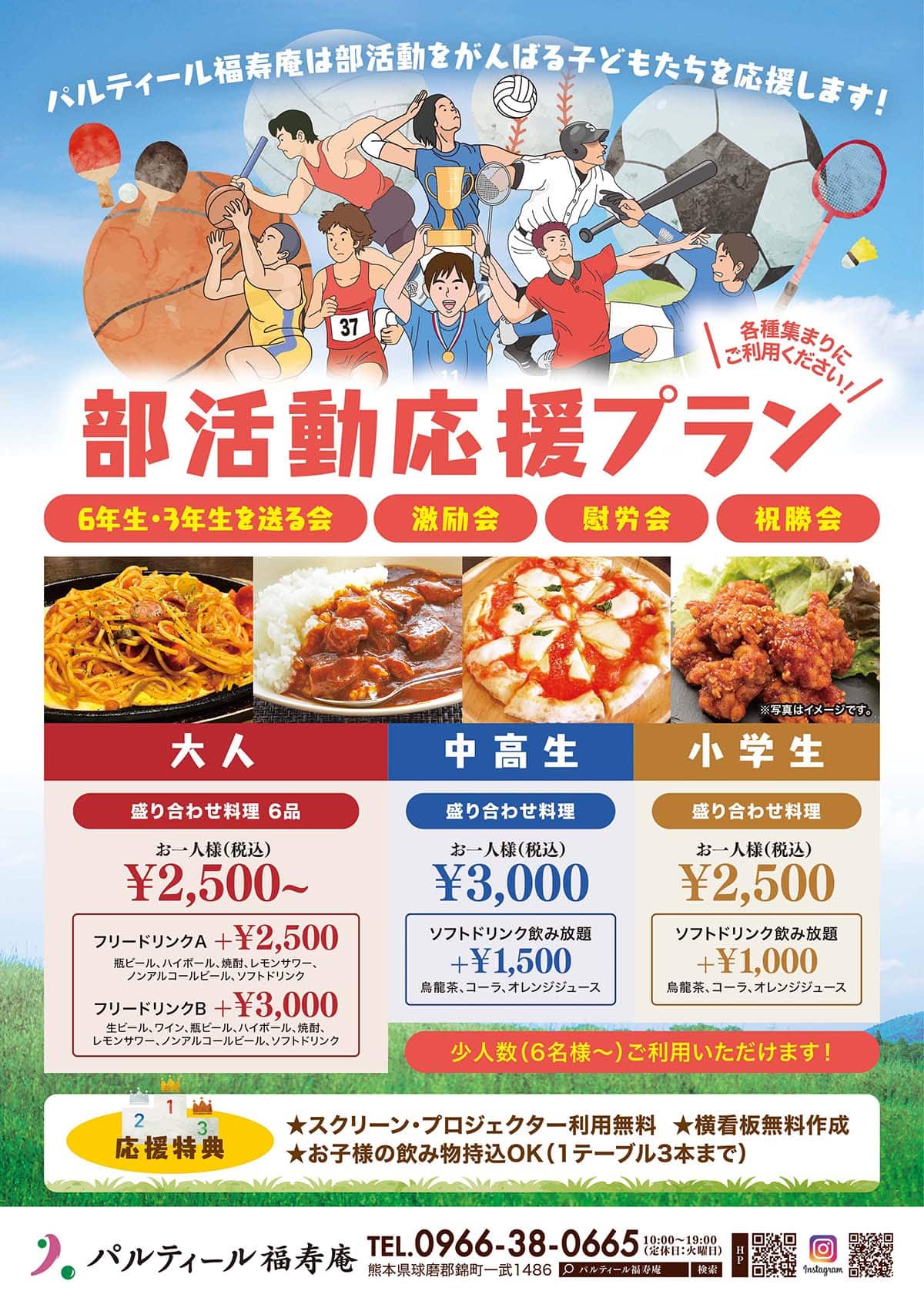 子どもたちの活動をサポートし、思い出に残る素晴らしいご宴会をお手伝いいたします。パルティール福寿庵は、人吉・球磨地域での部活動・クラブ活動に強いパートナーです。どうぞお気軽にご連絡ください。